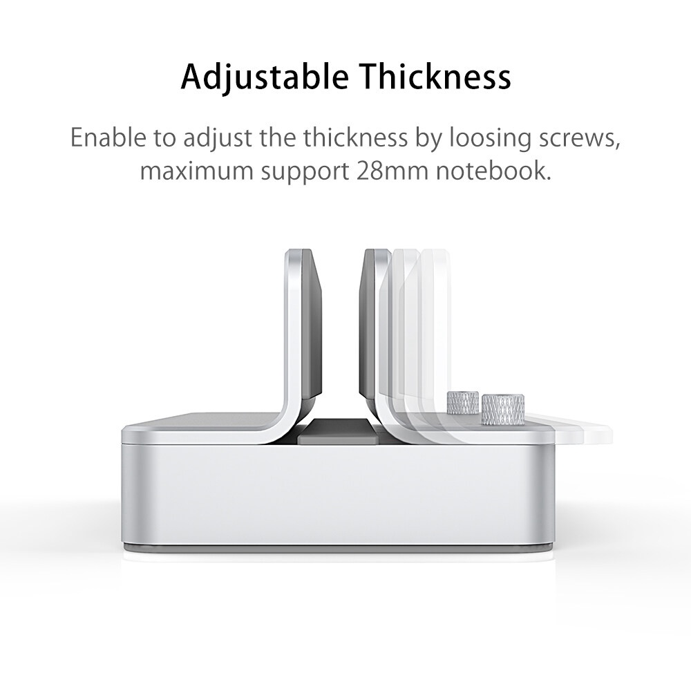 Có thể điều chỉnh độ dày của Trạm Sạc lưu trữ từ một bên của nó, nới lỏng hai ốc vít để di chuyển hộp nhôm. Hỗ trợ Sổ Ghi Chép có độ dày 28mm. Có cao su chống trượt ở hai bên và dưới cùng của khối nhôm để tránh trầy xước do tai nạn.