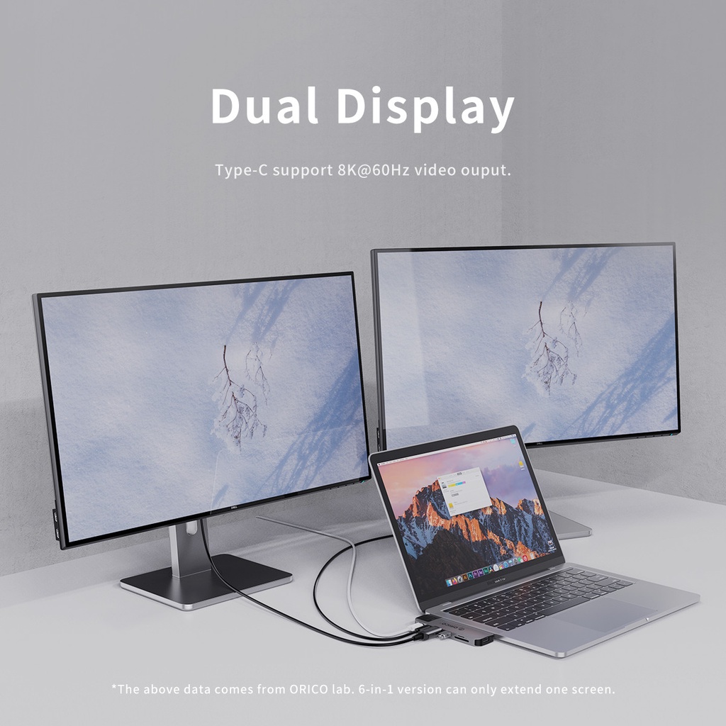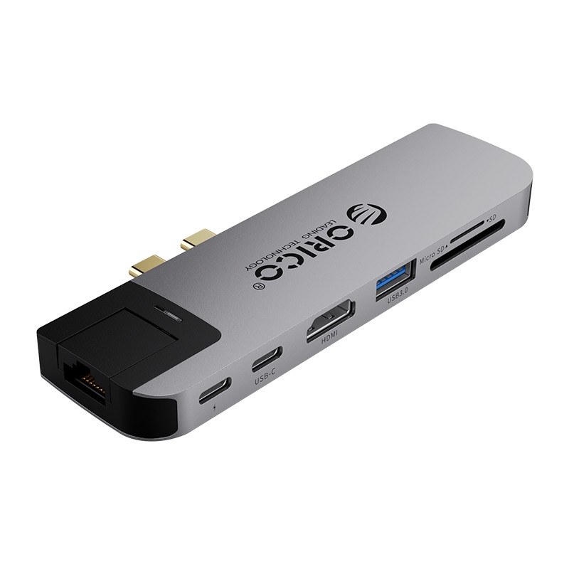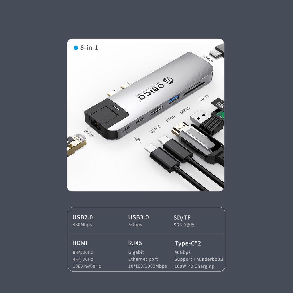 Giới thiệu Dock Sạc Chuyển Đổi Orico 2CT-8HR-GY-BP Type C Thunderbolt3 MacBook HDMI 4K@30Hz/ PD 100W Max/ USB(3.0/2.0) TF/SD RJ45