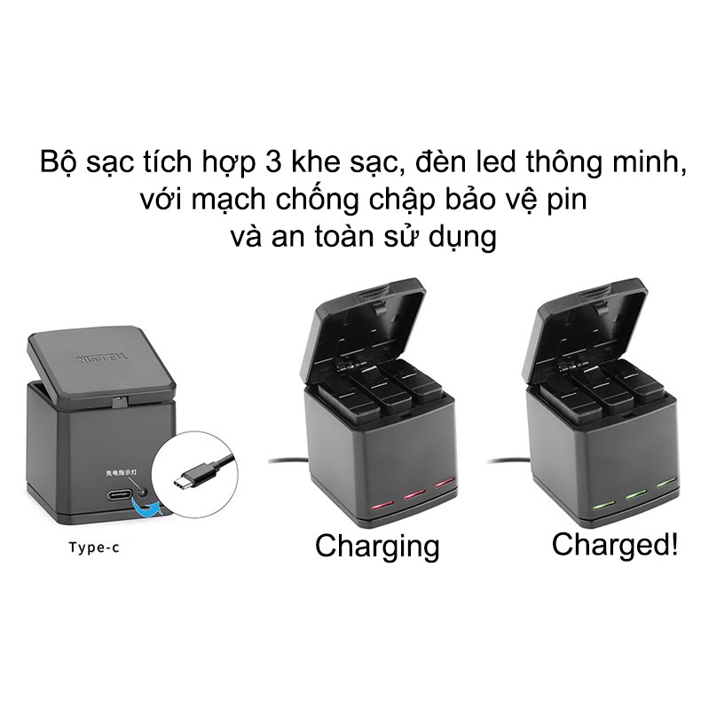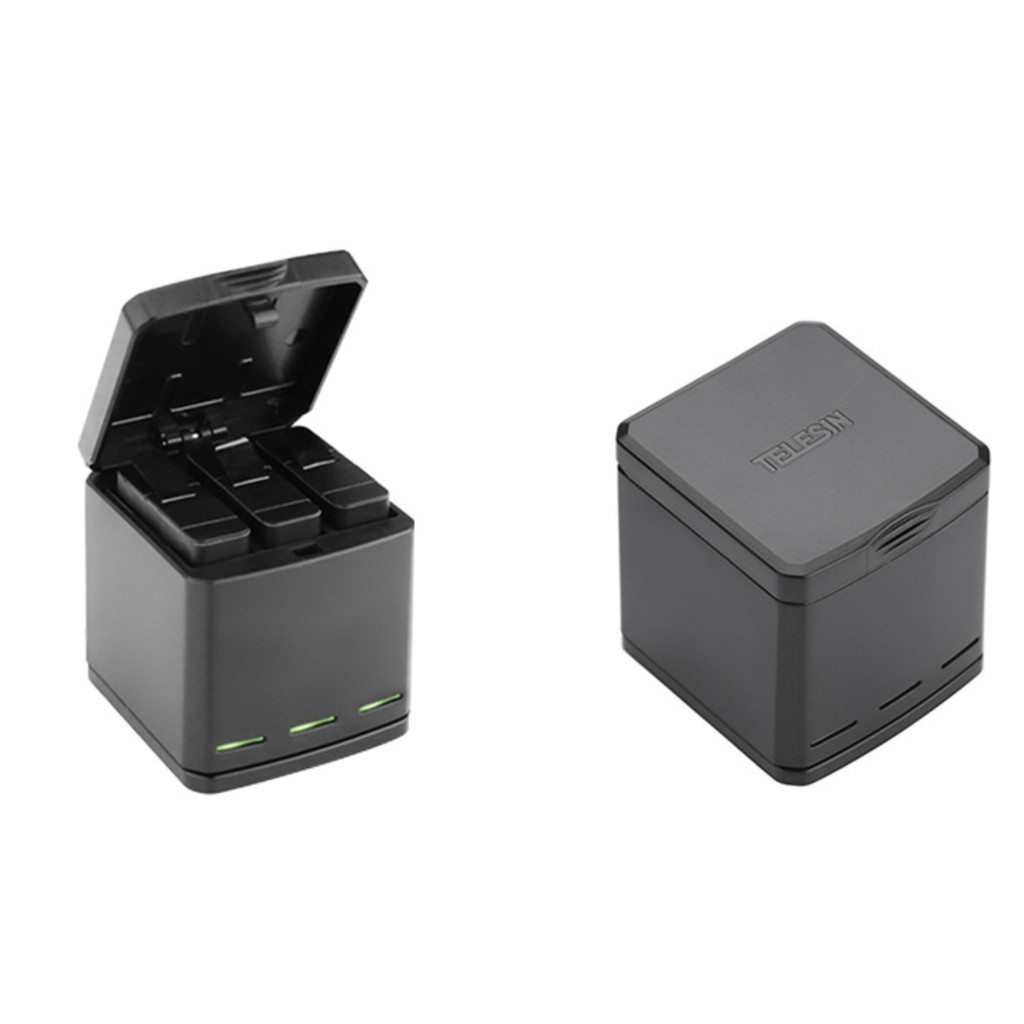 Sản phẩm sạc dành cho Gopro Hero 5 6 Black, 7 black white silver, hero 2018, gopro 8 black. Chính hiệu TelesinSản phẩm nhỏ gọn tiện dụng, có nắp đậy bảo vệ pin khi sạc. Vỏ mịn chống trầy, chống thấm