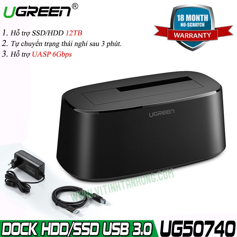 Dock HDD/SSD SATA 2.5/3.5" Hỗ trợ 12TB, Tốc độ 6Gbps Ugreen 50740Dock dữ liệu ổ cứng SATA HDD/SSD USB 3.0 Ugreen 50740 là phụ kiện giúp đọc và ghi giữ liệu từ ổ cứng SSD và HDD với máy tính, laptop, điện thoại và các thiết bị khác, hỗ trợ ổ cứng dung lượng lên đến 12TB với tốc độ lên đến 5Gbps cho kết nối USB 3.0 và hỗ trợ công nghệ UASP giúp tăng tốc độ truyền tải lên đến 6Gbps (Chú Ý: UASP là chỉ có sẵn cho WIN8 Mac OS 8&9).