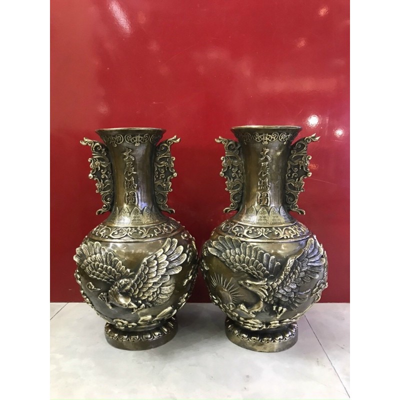 - Đôi lọ hoa bằng đồng vàng nguyên chất hun màu giả cổ đúc nổi họa tiết đại bàng và cây tùng- Lọ cao 36cm đường kính miệng 20,5cm nặng 10,5kg/ 1 đôi.