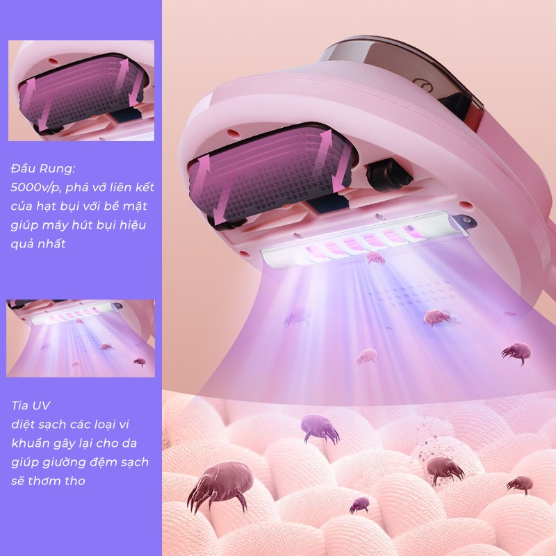 - Máy hút bụi diệt khuẩn cầm tay Yangzi CM08 thiết kế hệ thống quang nhiệt cùng tia UV hoạt động rung với tần số cao (5000lần/phút) nhằm ức chế các loại vi khuẩn, bọ chét bám trên từng thớ vải, làm khô nhanh chóng bề mặt, hạn chế phát sinh vi khuẩn ở một khoảng thời gian sau đó.