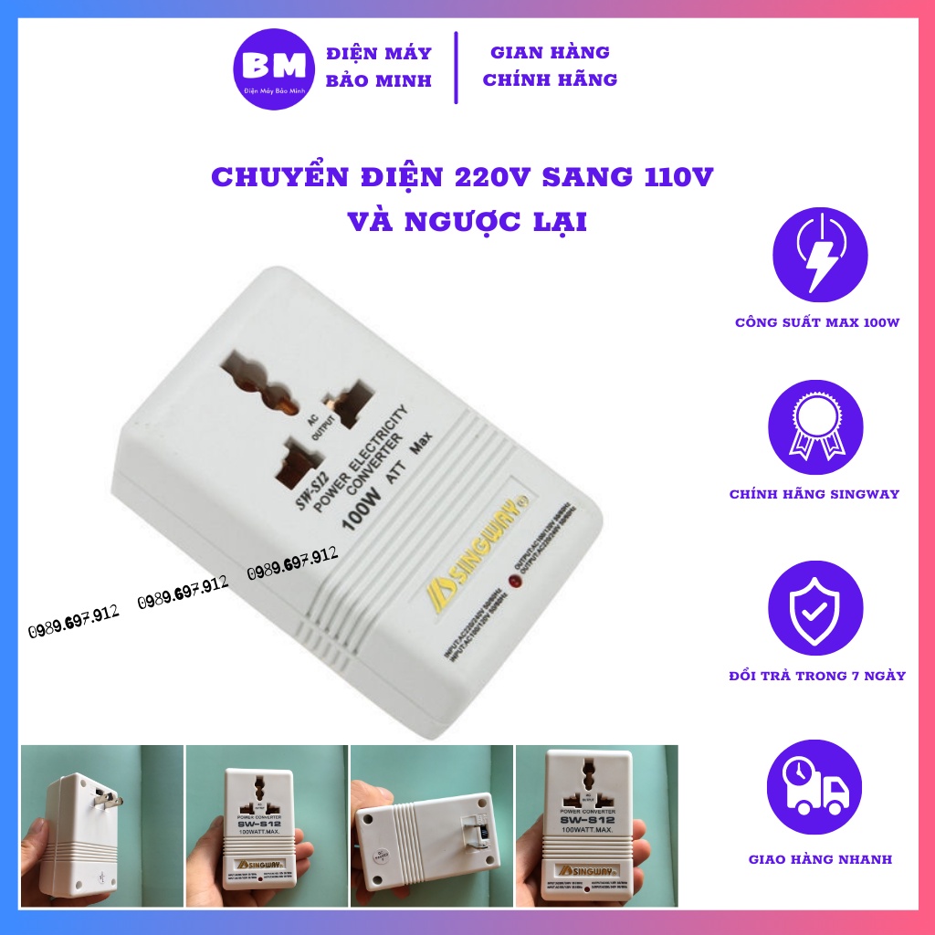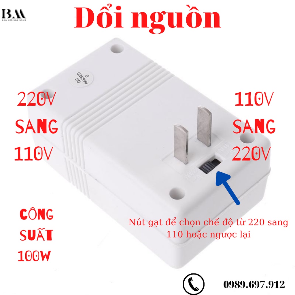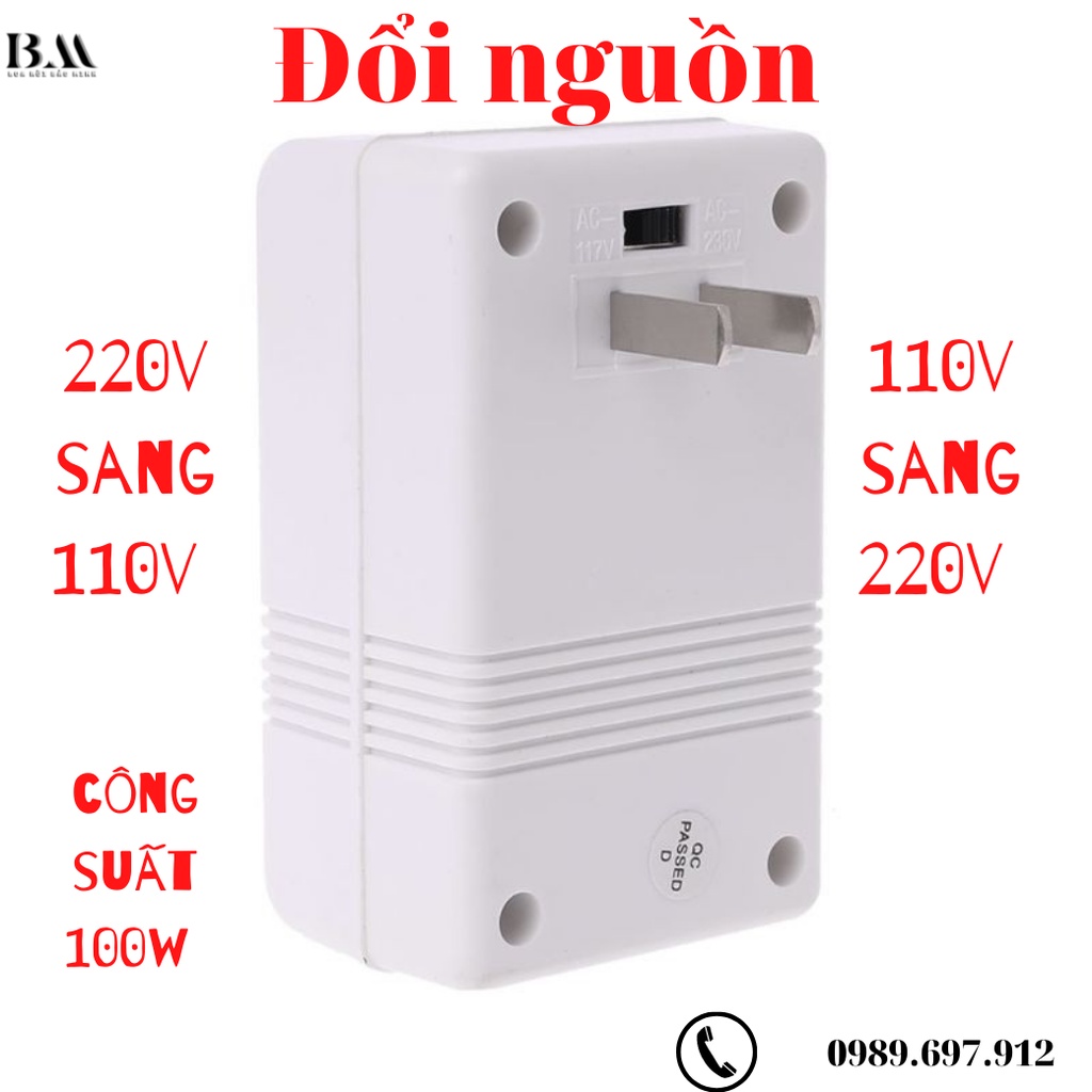 Biến áp 220V ra 110V Hoặc ngược lại Công suất 100wTrước khi mua sản phẩm bạn cần kiểm tra kỹ xem thiết bị điện của bạn có công suất sử dụng là bao nhiêu để tìm sản phẩm phù hợp vì nếu biến áp có công suất nhỏ hơn thiết bị của bạn sẽ không sử dụng được (gây cháy biến áp)