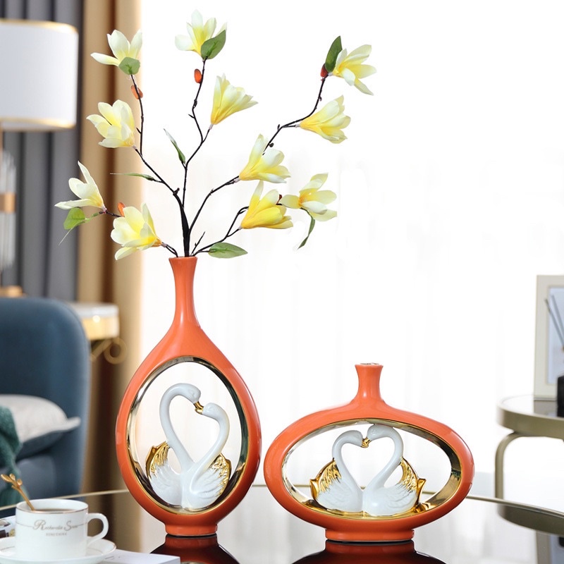 Đôi Thiên Nga gốm sứ mạ mầu vàng trang trí gồm 2 bình Huydecor