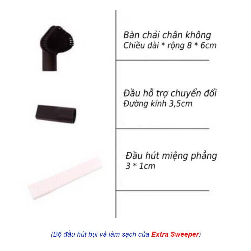 Thêm một điểm cộng của sản phẩm này nằm ở hình thức được thiết kế tối ưu cho sự tiện dụng: thân máy được chia làm hai phần: phần cán dài 53cm có thể tháo rời và phần hộp máy 51cm có tay cầm, tổng chiều dài cây hút bụi là 104cm để người dùng có thể tháo - lắp dễ dàng tuỳ thuộc vào mục đích sử dụng. Người dùng có thể lắp thêm thanh dài cầm tay khi hút bụi sàn nhà, hoặc tháo rời phần đầu máy cầm tay để hút bụi sofa, giường, rèm cửa. Rất đa năng và tiện lợi!Ưu điểm nổi bật ở bộ sản phẩm này là nó có đến 4 đầu hút với những công dụng khác nhau giúp ích cho các chị em chúng mình. Ngoài chức năng hút bụi, Extra Sweeper còn có thêm đầu chải bụi bẩn trên vải và đầu lau sàn cực kỳ độc đáo. Cùng mình tìm hiểu về những công dụng đặc biệt của những đầu sử dụng của bộ máy hút bụi Extra Sweeper này nhé!!!