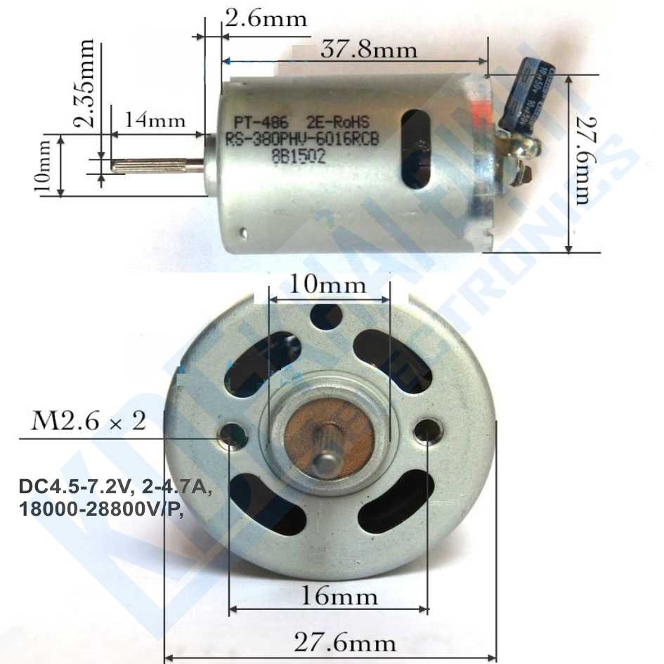 Giới thiệu động cơ DC RS-380 6V 24000V/P 4.5-7.2V 20W, trục 2.35mm, CÓ TỤ kde2618