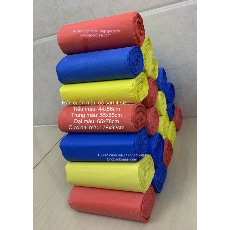 - Túi rác cuộn 3 màu không lõi được đóng thành từng cuộn nhỏ mỗi cuộn cỡ 300gr và đóng trong một bao với 3 màu xanh, đỏ, vàng có khối lượng 1kg.- TÚI RÁC CUỘN MÀU CÓ SẴN CÁC KÍCH THƯỚC NHƯ: