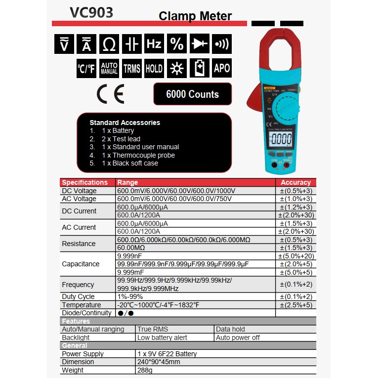 THÔNG SỐ KỸ THUẬT: Đồng hồ ampe kìm vạn năng chất lượng cao Zoyi VC903 đo AC/DC1200V