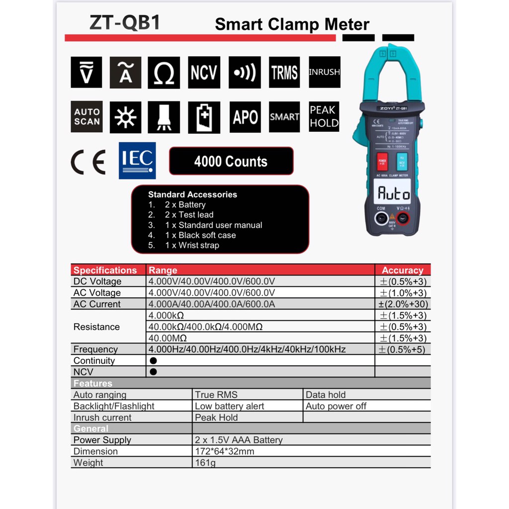 ĐỒNG HỒ AMPE KÌM ZOYI ZT-QB1 ĐO ĐIỆN ĐO ĐIỆN VẠN NĂNG - HÀNG CHÍNH HÃNG - BẢO HÀNH 12 THÁNGTHÔNG SỐ KỸ THUẬT: Đồng Hồ Ampe Kìm Zoyi Zt-Qb1 Đo Điện Đo Điện Vạn Năng