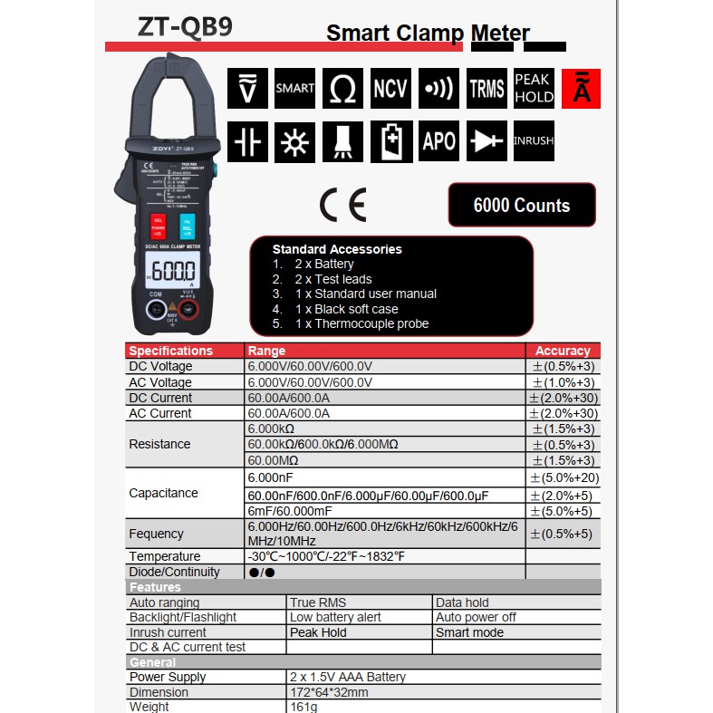ĐỒNG HỒ AMPE KÌM ZOYI ZT-QB9 ĐO ĐIỆN ĐO ĐIỆN AC/DC VẠN NĂNG - HÀNG CHÍNH HÃNG - BẢO HÀNH 12 THÁNGTHÔNG SỐ KỸ THUẬT: Đồng Hồ Ampe Kìm Zoyi Zt-Qb9 Đo Điện Đo Điện AC/DC Vạn Năng