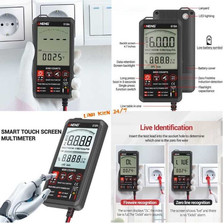 Tính năng sản phẩm:Đồng hồ auto vạn năng kỹ thuật số cảm ứng thông minh ANENG 618A chính hãng với phím cảm ứng, đồng hồ đo tuyến tính kết hợp thành một, tự động, độ chính xác cao, có thể đo chính xác điện áp DC/AC, đo điện dung, đo diode, đo điện trở, đo thông mạch, cảm ứng điện dung, nhận dạng dây có điện. Đo chip tốc độ cao thông minh kép chính xác hơn giúp bạn có 1 công cụ đa năng để dễ dàng đo kiểm tra, thực hiện các thí nghiệm cơ bản về điện.