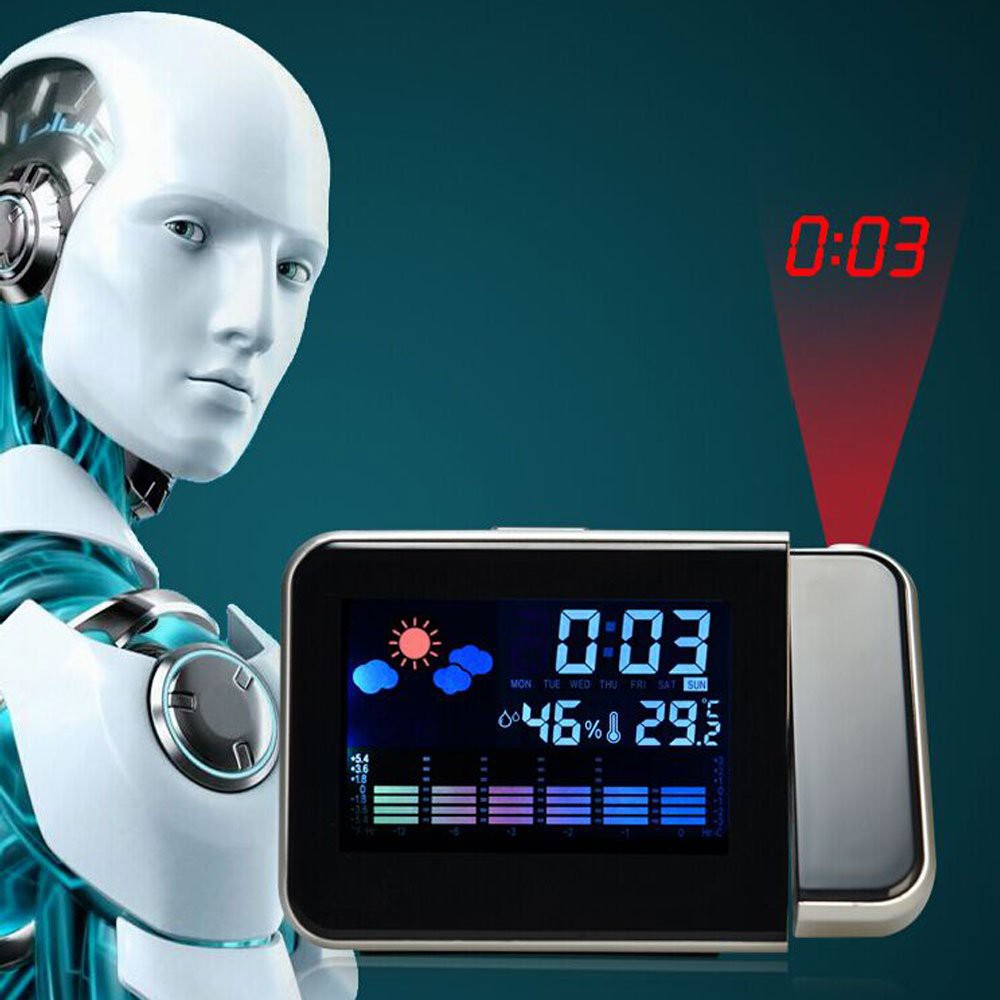 Đồng hồ có màn hình đủ màu hiển thị thời gian, nhiệt độ, độ ẩm và chiếu thời gian lên mọi bức tường hoặc trần nhà trong bóng tối.Dễ dàng cài đặt Màn hình màu và đèn nền LED
