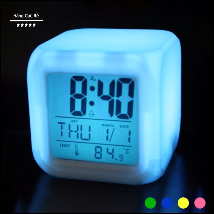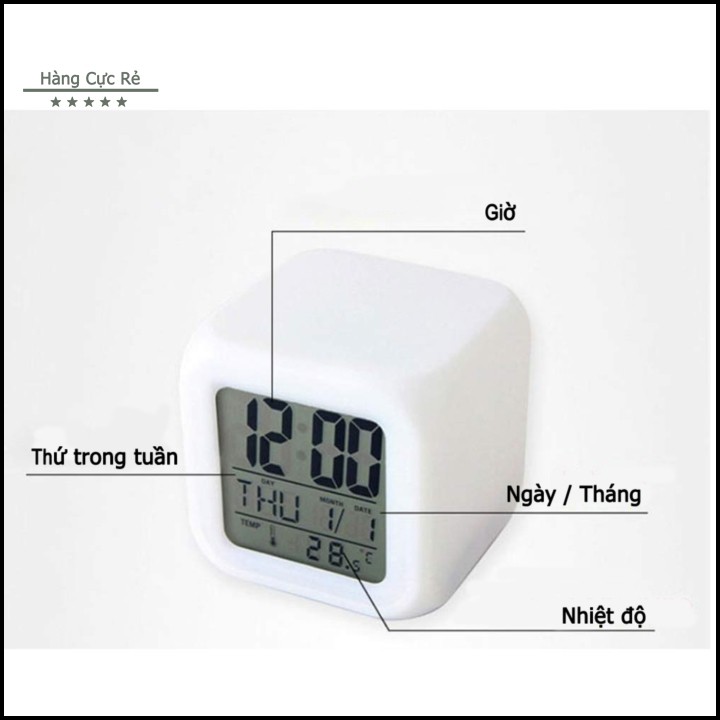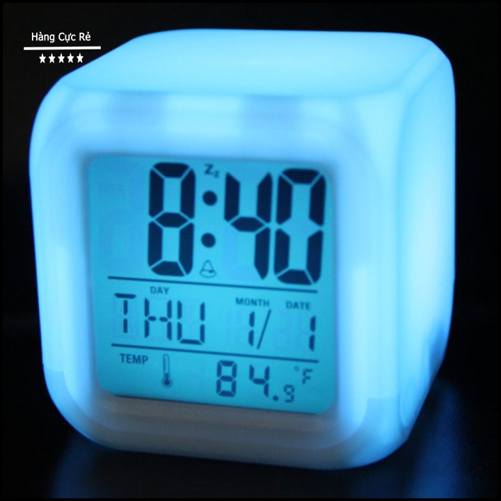 7 màu sắc thay phiên nhau xuất hiện tạo cho bạn một cảm giác thư thái, nhẹ nhàng. Ngoài tính năng báo thức, hiển thị giờ, thứ, ngày, tháng nó còn được trang bị nhiệt để đo nhiệt độ môi trường xung quanh điều này giúp bạn chăm sóc sức khỏe cho gia đình và đặc biệt có thể chăm sóc sức khỏe cho bé tốt hơn