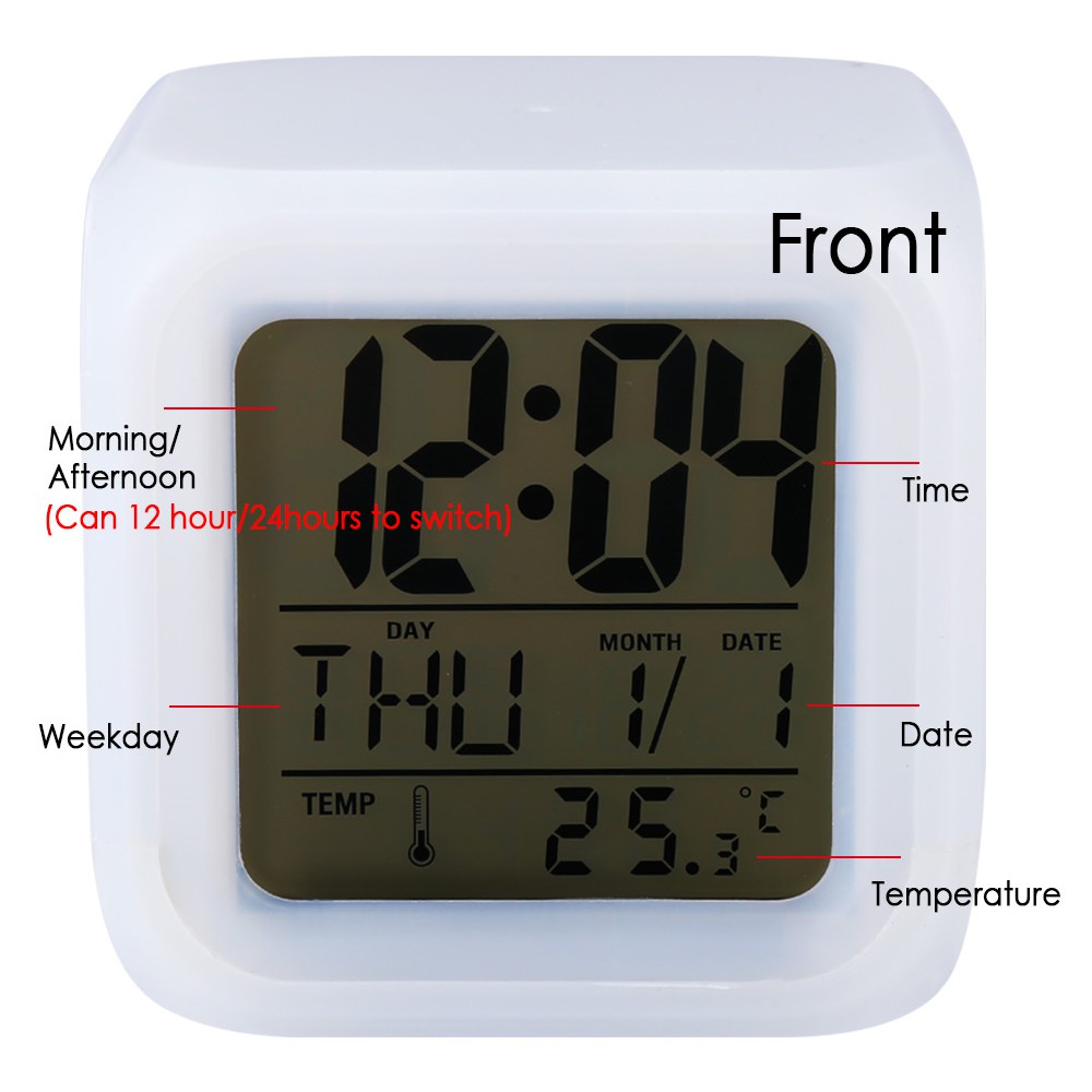 - 7 màu sắc thay phiên nhau xuất hiện tạo cho bạn một cảm giác thư thái, nhẹ nhàng. Ngoài tính năng báo thức, hiển thị giờ, thứ, ngày, tháng nó còn được trang bị nhiệt để đo nhiệt độ môi trường xung quanh điều này giúp bạn chăm sóc sức khỏe cho gia đình và đặc biệt có thể chăm sóc sức khỏe cho bé tốt hơn