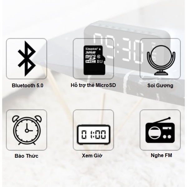 - Hỗ Trợ Mặt gương, Xem giờ, Đồng hồ báo thức, Nghe FM, Thẻ nhớ MicroSD
