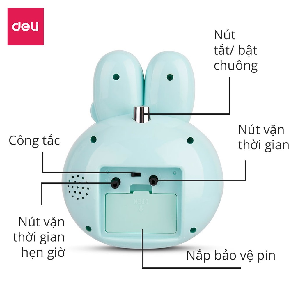 Giới thiệu Đồng hồ báo thức thỏ hoạt hình Deli - 3 màu Trắng/ Xanh/ Hồng - 8803