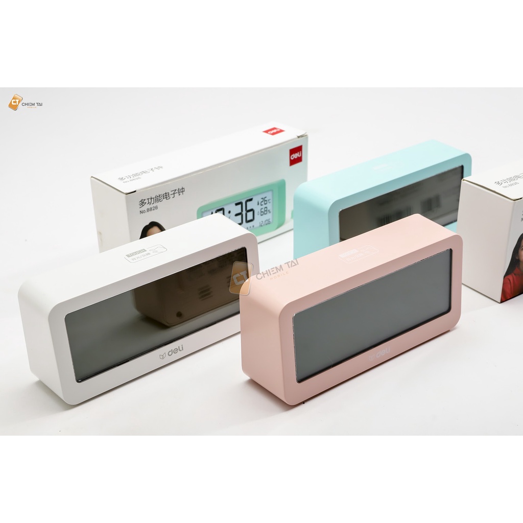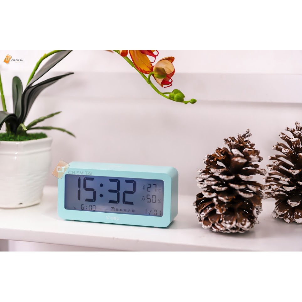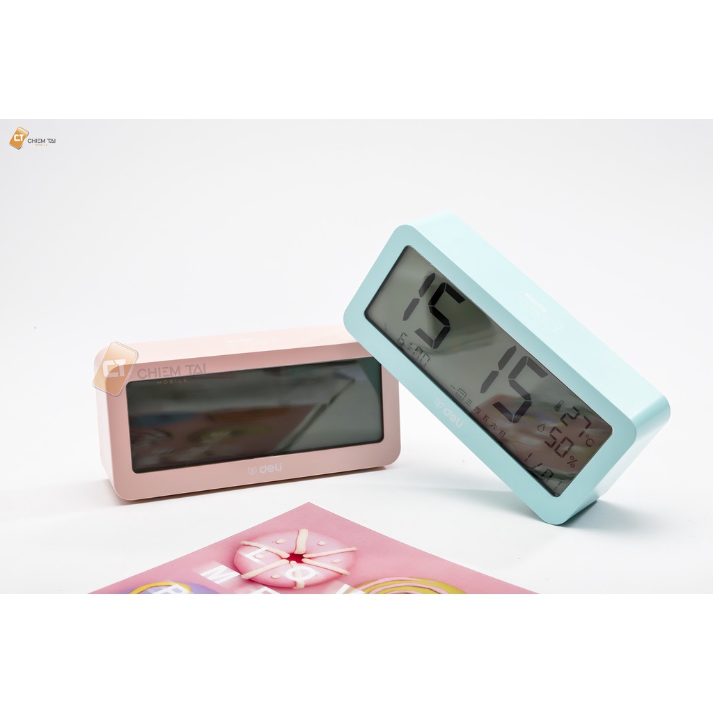 Bên cạnh chức năng báo thức, hiển thị thời gian, đồng hồ điện tử DELI còn có thể được dùng để thay thế cho thiết bị nhiệt ẩm kế. Sản phẩm được tích hợp cảm biến độ nhạy cao, hỗ trợ đo chính xác dữ liệu nhiệt độ và độ ẩm trong nhà. Ngoài ra, thiết kế nhỏ gọn đi kèm 3 phiên bản màu sắc năng động giúp đồng hồ trở thành một món đồ trang trí đẹp mắt cho mọi không gian làm việc và học tập.