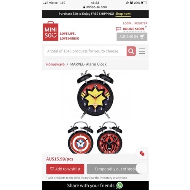 đồng hồ cho các con ạ. Để bàn học, báo thức quá tiện và đẹpĐồng hồ báo thức Miniso x Ma@rvel phiên bản kết hợp 2 hãng mới về siêu đẹp luôn các mẹ ạ. Bé trai bé gái đều ok ạ