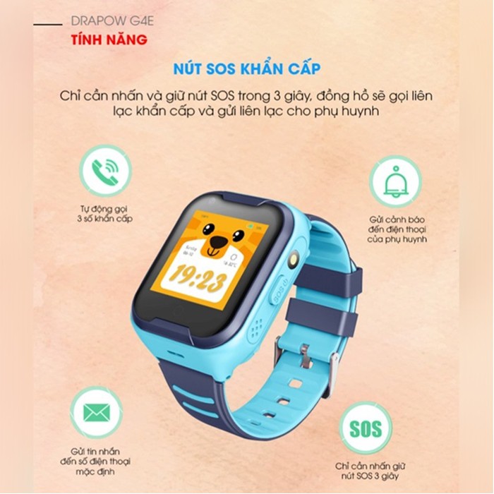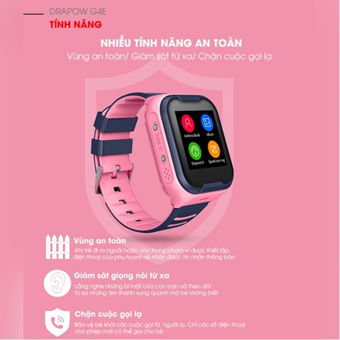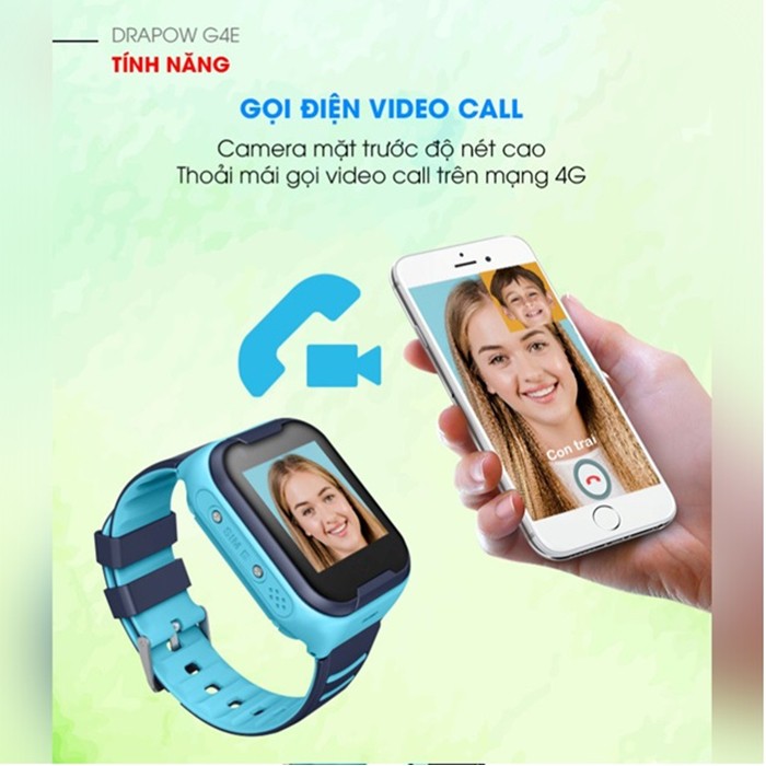 Đồng hồ định vị trẻ em Drapow G4E là mẫu đồng hồ định vị trẻ em mới nhất và hỗ trợ nghe gọi video tốt nhất hiện nay. Ngoài những tính năng cơ bản như nghe gọi, định vị, nhắn tin,... thì Drapow G4E còn được trang bị những tính năng ưu việt khác như định vị với công nghệ Wifi, hỗ trợ màn hình cảm ứng, tích hợp 1 camera ở mặt trước,...Đặc biệt là khả năng nghe gọi video call với điện thoại qua wifi hoặc 3G, 4G. Đây là điểm nổi bật nhất của Drapow G4E so với những sản phẩm khác trên thị trường.Gọi điện video call - Kết nối 4G