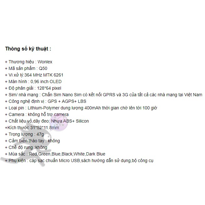 Wonlex là hãng sản xuất các dòng đồng hồ định vị dành cho trẻ em hàng đầu tại Trung Quốc. Sản phẩm của hãng được bán trên toàn cầu và được ưa chuộng trong thị trường nội địa, Châu Mỹ, Châu Âu, Châu Á, Đông Nam Á… Hiện tại, Wonlex là thương hiệu đồng hồ định vị dành cho trẻ em lớn nhất tại thị trường Việt Nam vì chất lượng tốt và giá cả phải chăng.Đặc điểm nổi bật của Đồng hồ định vị giá rẻ #Q50 chính hãng #Wonlex