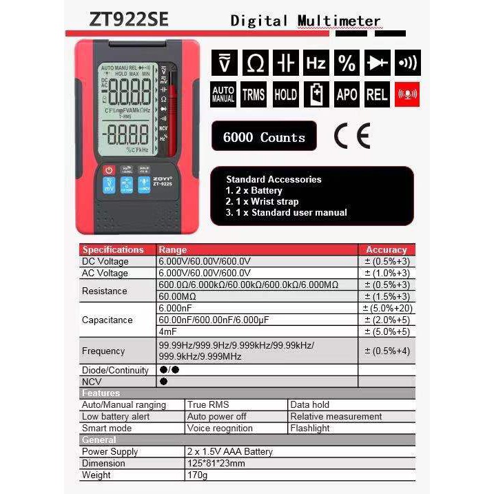 THÔNG SỐ KỸ THUẬT: Đồng Hồ Đo Điện Vạn Năng Zoyi Zt-922 Và Zt-922S Điều Khiển Bằng Giọng Nói