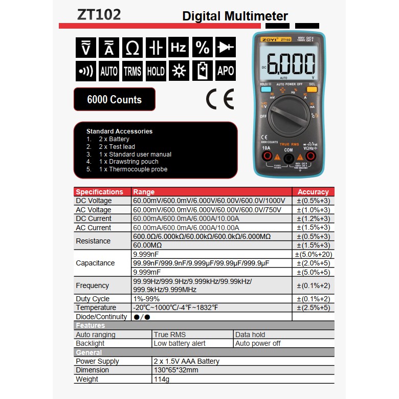 THÔNG SỐ KỸ THUẬT: Đồng Hồ Đo Điện Vạn Năng Zoyi ZT-102 Đo Điện Đa Năng Hiển Thị Kỹ Thuật Số
