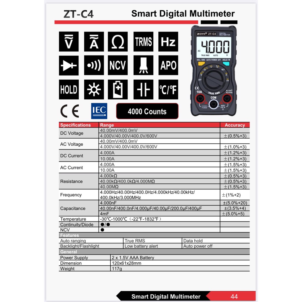 THÔNG SỐ KỸ THUẬT: Đồng Hồ Đo Điện Vạn Năng Zoyi Zt-C4
