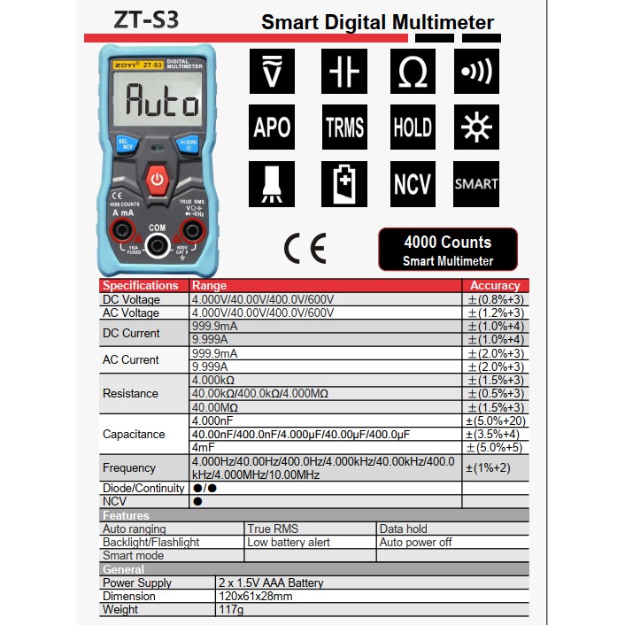THÔNG SỐ KỸ THUẬT: Đồng Hồ Đo Điện Zoyi Zt-S3 Đo Điện Vạn Năng Tự Động