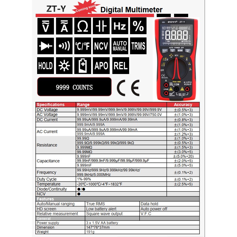 THÔNG SỐ KỸ THUẬT: Đồng Hồ Đo Điện Zoyi Zt-Y Cao Cấp Đo Điện Vạn Năng Tự Động 9999 Số Đếm