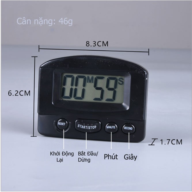 - Vô cùng dễ sử dụng với 4 nút bấm. với mỗi lần nhấn nút “minute” là đồng hồ tăng lên 1 phút tương tự với nút “second”. Sau khi thiết lập thời gian xong, bạn chỉ cần nhấn nút “start/Stop” để đồng hồ bắt đầu tính giờ. Khi cần xóa thiết lập cũ, bạn chỉ cần nhấn nút “reset” là đồng hộ lập tức trở về giá trị 0.