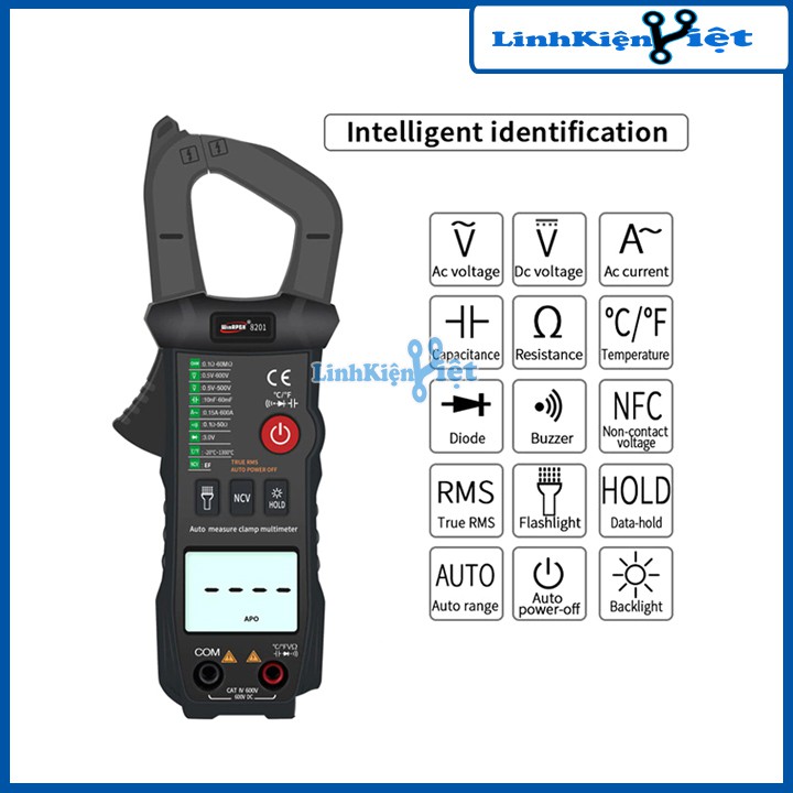 Đồng Hồ Kẹp Dòng WinAPEX 8201Đồng hồ vạn năng này được sử dụng để đo điện áp, dòng điện DC và AC, điện trở, điện dung, kiểm tra thông mạch, đo tần số, đo RMS thực và các tính năng khác. Các thang đo đều được tự động, có thể lựa chọn thang đo hoặc để auto.