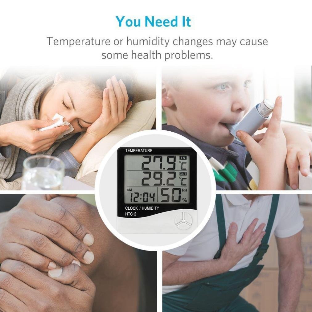 Đồng Hồ LED Để Bàn Có Dây Cảm Biến – Đồng Hồ LED Nhiều Chức Năng HTC2 – Đồng Hồ Điện Tử Để Bàn. Đồng hồ đo độ ẩm, nhiệt độ trong phòng và ngòai trời, Thời gian & Lịch HTC2 là thiết bị đồng hồ đa năng, đa tiện ích giúp bạn biết được nhiệt độ trong, độ ẩm để phòng tránh một số bệnh như cảm lạnh, viêm mũi, viêm xoang, huyết áp cao, bệnh hô hấp ở trẻ em và người già.... Nhiệt ẩm kế HTC-2 (phiên bản 2) đo nhiệt độ và độ ẩm không khí trong phòng và ngoài trời (thiết bị cảm biến rời có dây dẫn dài 1met làm bằng thép không rỉ) có tính năng lựa chọn thang đo oC và oF, sử dụng công nghệ mạch đo tiêu hao năng lượng thấp, tính thẩm mỹ cao. * Màn hình LCD lớn hiển thị nhiệt độ, độ ẩm & Thời gian tại cùng một thời điểm lý tưởng cho gia đình, văn phòng, du lịch và trường học.- Kích thước nhỏ gọn, kiểu dáng sang trọng giúp bạn dễ dàng đặt ở bất kỳ đâu như trên bàn làm việc, phòng ngủ, bàn học sinh, dễ dàng đem theo trong các chuyến du lịch, dã ngoại...