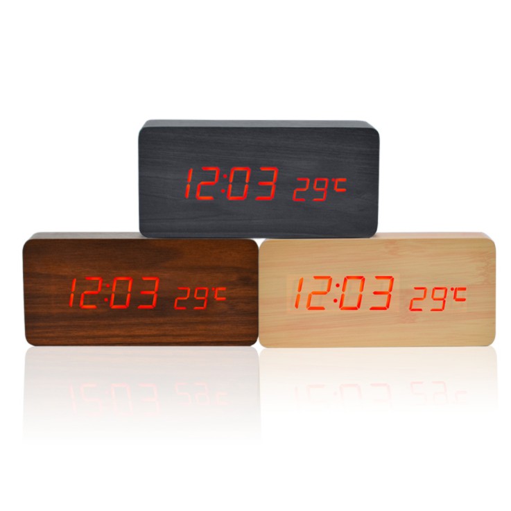 Đồng Hồ LED Gỗ Để Bàn Có Báo Thức, Đo Nhiệt Độ, Cảm Biến Âm Thanh