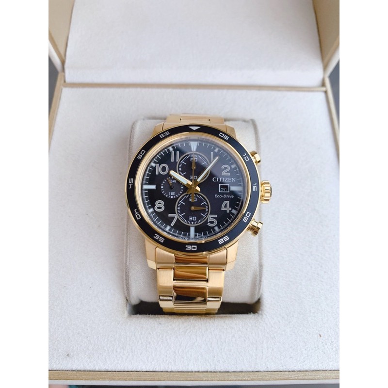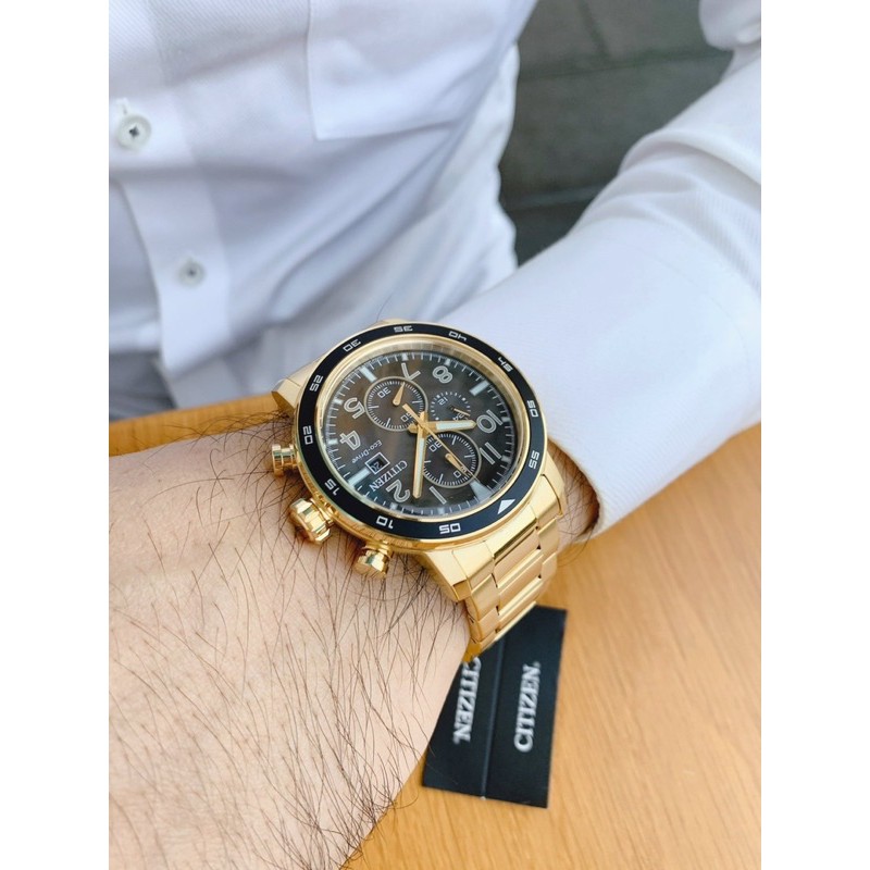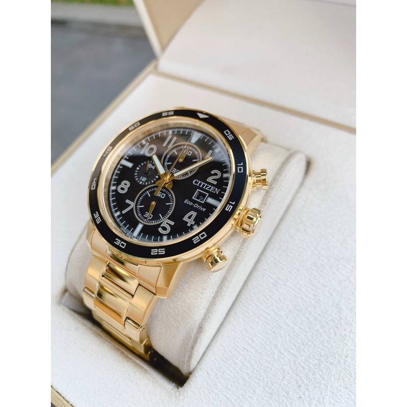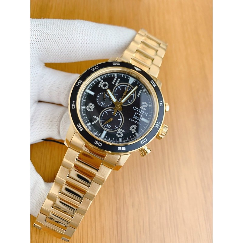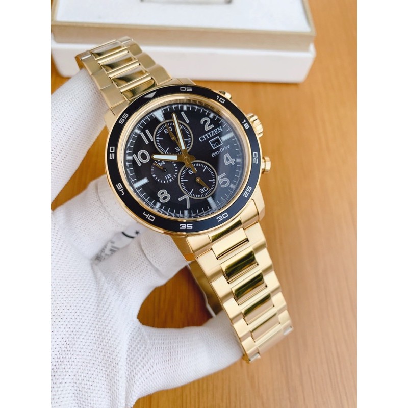 Sẵn giao 3️⃣❎❎❎Citizen Eco-Drive Men's Brycen Chronograph Date Gold-Tone CA máy Ecodrive sạc năng lượng bằng mọi ánh sáng, không lo thay pin. Dây mạ vàng siêu đẹp. Vỏ thép không gỉ.
