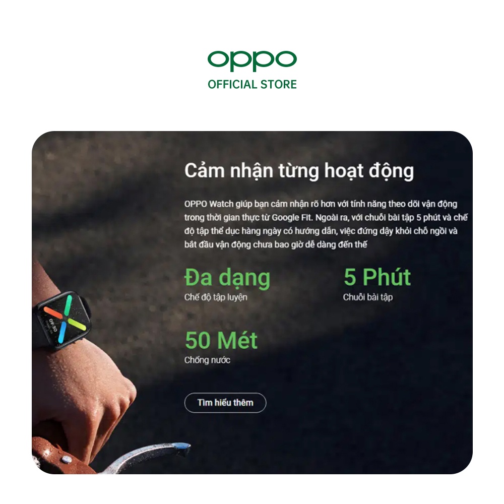 Đồng hồ thông minh OPPO hoạt động như một công cụ theo dõi thể dục cơ bản. Mặt đồng hồ hiển thị số bước chân, thời gian tập luyện, lượng calo được đốt cháy… giúp bạn kiểm soát hoạt động hiệu quả. Với nhiều bài tập thú vị, OPPO Watch khuyến khích người dùng vận động tích cực hơn, hướng đến lối sống khỏe mạnh và năng động hơn.