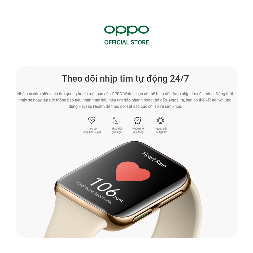 Nhờ các cảm biến nhịp tim quang học ở mặt sau của OPPO Watch, bạn có thể theo dõi được nhịp tim của mình. Đồng thời, máy sẽ ngay lập tức thông báo nếu nhận thấy dấu hiệu tim đập nhanh hoặc thở gấp. Ngoài ra, bạn có thể kết nối với ứng dụng HeyTap Health để theo dõi sát sao các chỉ số về sức khỏe.