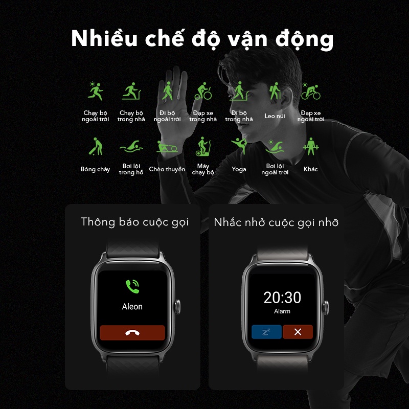 🔵Nhiều chế độ vận động: Chạy bộ ngoài trời, Chạy bộ trong nhà, Đi bộ ngoài trời, Đạp xe trong nhà, Đi bộ trong nhà, Bóng chày, Chèo thuyền, Máy chạy bộ, Hiển thị thông báo...
