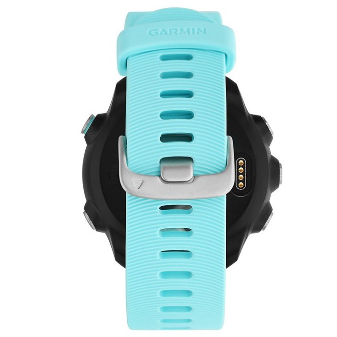 - Dây đeo silicone mang lại cảm giác thoải mái cho cổ tay, không bị đau khi đeo lâu dài. Thân vỏ đồng hồ được làm hoàn toàn bằng nhựa nên có khối lượng rất nhẹ, chỉ 38.5g. Ở phiên bản lần này, Garmin vẫn giữ nguyên thiết kế 5 nút cơ điều khiển và không có thao tác cảm ứng.