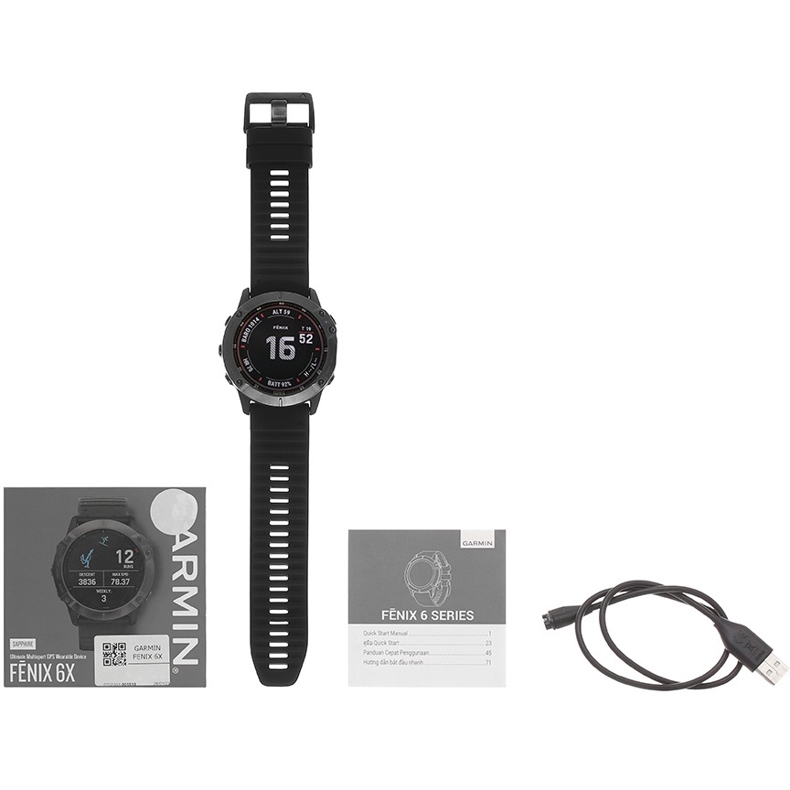 - Bộ sản phẩm gồm: Hộp, Sạc, Sách hướng dẫn.- Đồng hồ thông minh Garmin Fenix 6X Sapphire có màn hình kích thước 1.4 inch, độ phân giải 280 x 280 pixels giúp hiển thị hình ảnh và thông tin trên đồng hồ được rõ nét.