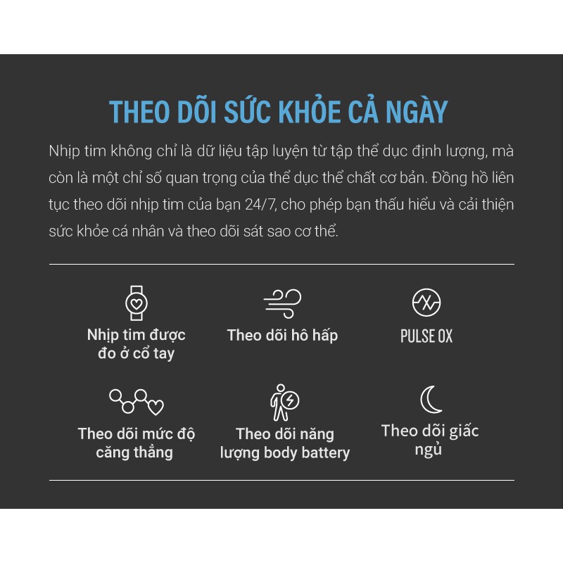 • Theo dõi sức khỏe 24/7 với tính năng theo dõi năng lượng Pulse Ox và Body Battery, theo dõi hô hấp, chu kỳ kinh nguyệt, mức căng thẳng, giấc ngủ, nhịp tim², lượng nước và nhiều chức năng khác.