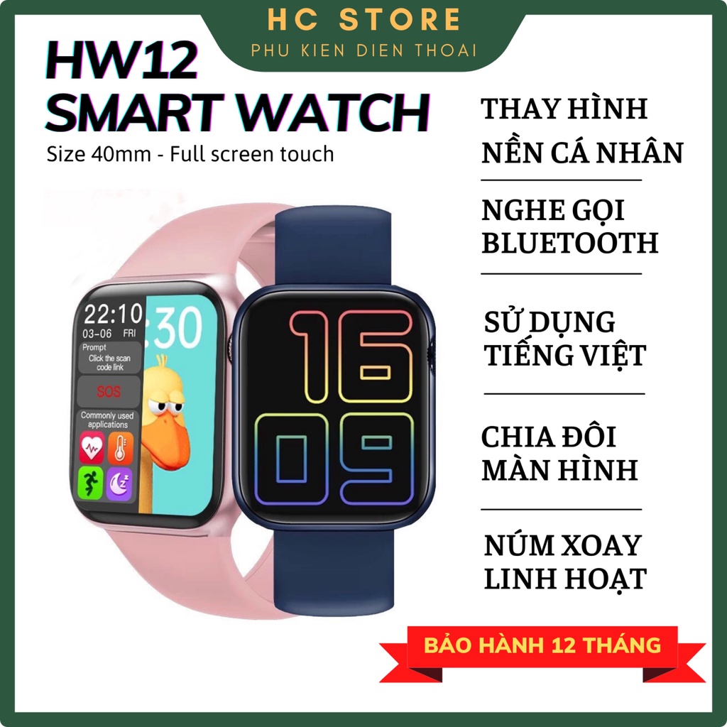Đồng hồ thông minh HW12, Nghe gọi, Thay hình nền, Cảm ứng siêu mềm mượt, Có tiếng việt, Đo nhịp tim, Chống nước IP67Xuất xứ: Trung Quốc