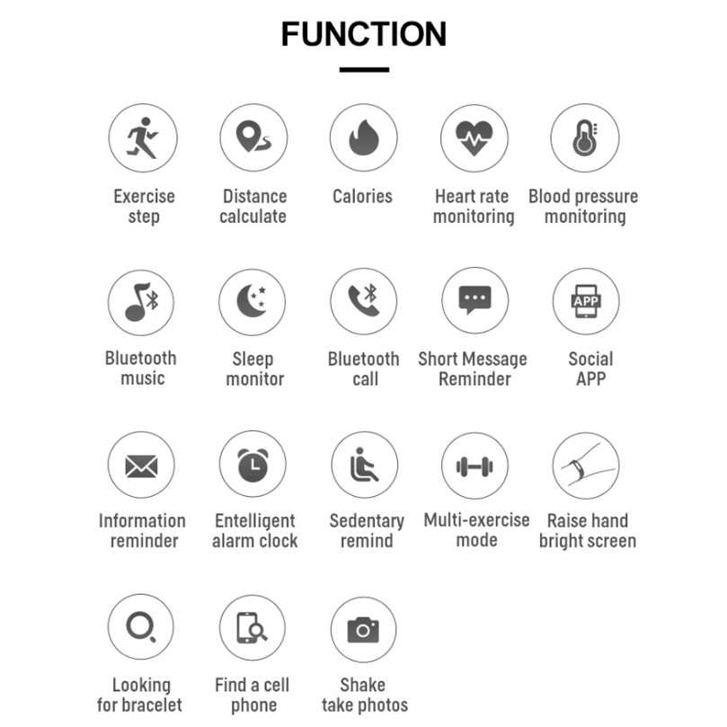 Màn hình dài sáng, màn hình sáng lật cổ tay, độ sáng tùy chỉnh, chế độ im lặng, vòng đeo tay, thể thao WeChat, lắc ảnh, điều khiển nhạc, đẩy thời tiết, đồng hồ bấm giờ, báo thức