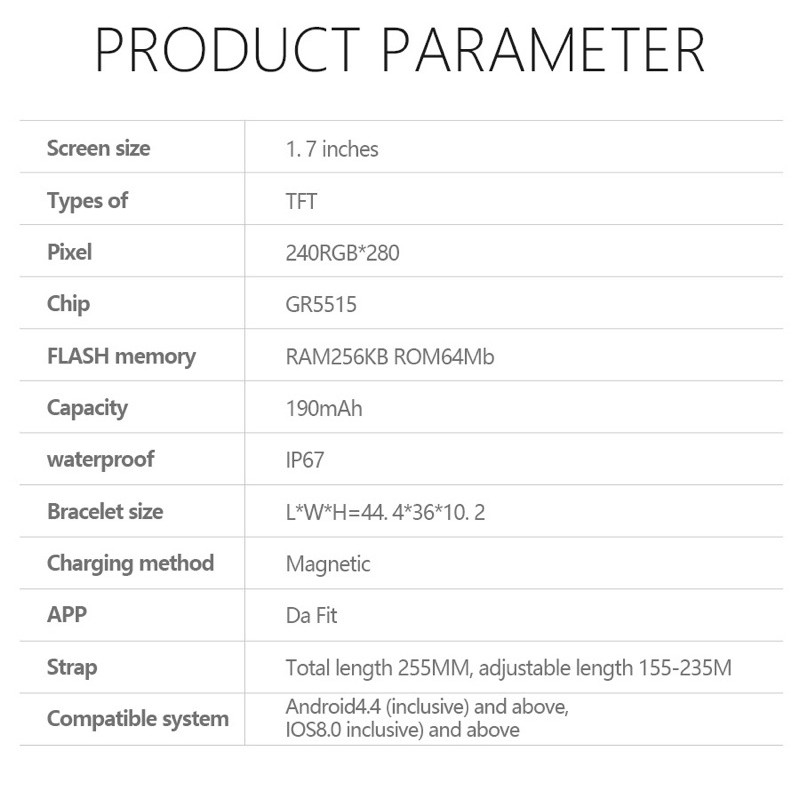 > Thể thao: Theo dõi hoạt động cả ngày, chống nước IP67, 8 chế độ tập thể dục, Đồng hồ bấm giờ, Báo cáo dữ liệu thể thao.