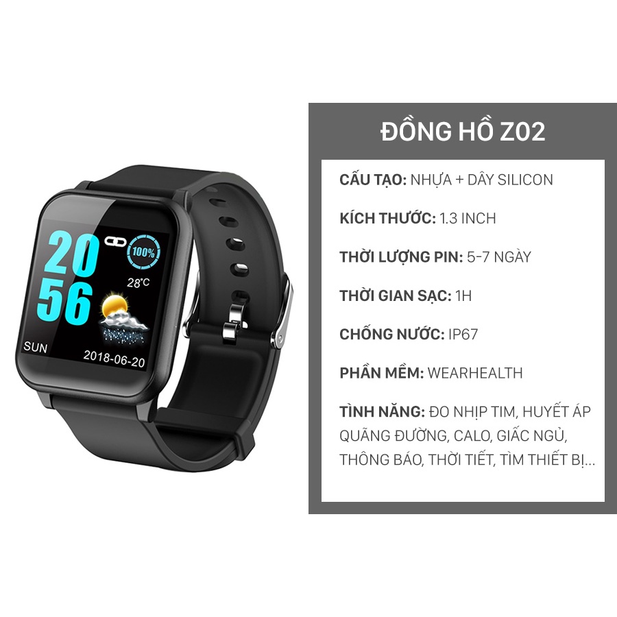 " Đồng hành cùng bạn trong những bài tập thể dục thể thao với một thiết bị theo dõi sức khỏe được kết hợp trong chiếc đồng hồ thông minh Z02, hứa hẹn sẽ mang đến những trải nghiệm thú vị và tiện ích "Sản phẩm nổi bật với những đặc điểm: