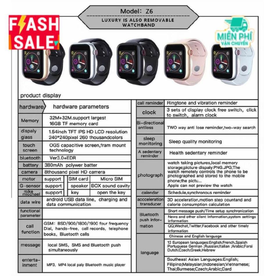 Điện Thoại & Phụ Kiện > Thiết bị đeo thông minh > Đồng hồ thông minh & Vòng đeo tay sức khỏe || Đồng hồ thông minh z6 phát Bluetooth hỗ trợ thẻ SIMCòn hàng