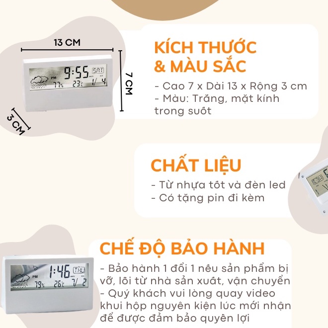 - Đồng hồ trang trí phòng ngủ có tính năng báo thức, chế độ hiển thị thời gian, ngày tháng, nhiệt độ cực kỳ tiện lợi.