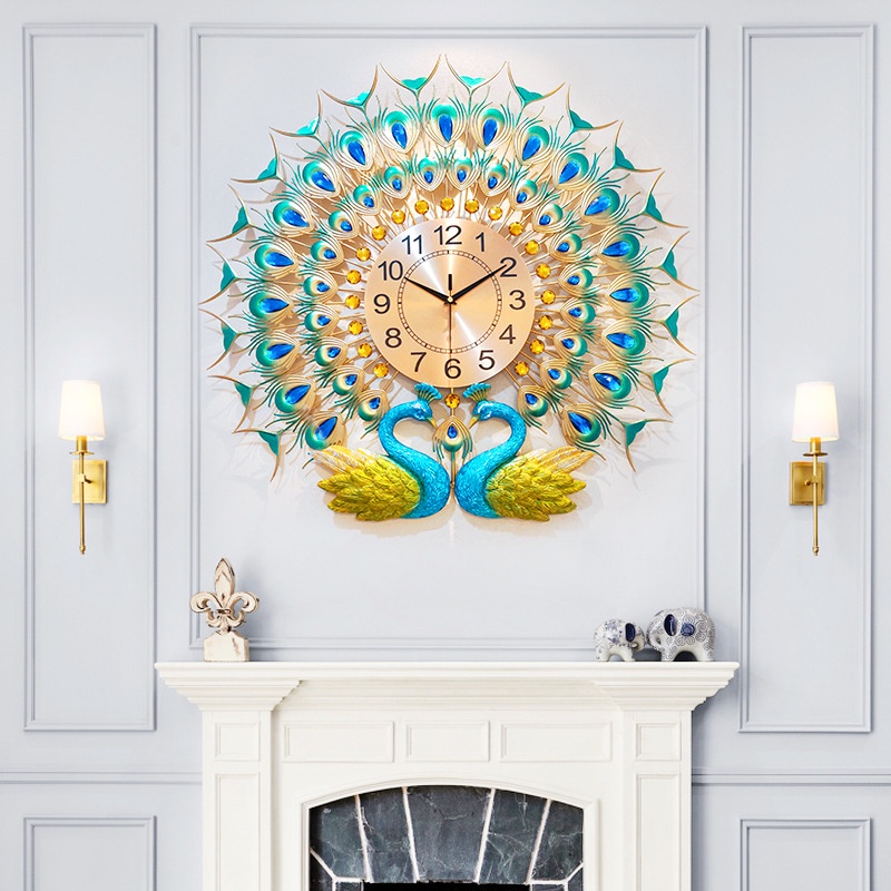 Đồng hồ trang trí treo tường đôi chim công xoè đuôi, đồng hồ decor treo tường phòng khách KD612