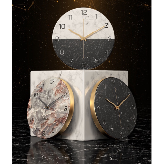 >> Đồng hồ treo tường với thiết kế hình tròn đơn giản, điểm nhấn chính là phần nền giả đá hoặc gỗ làm đồng hồ của mình nổi bật và không lẫn vào đâu được hết