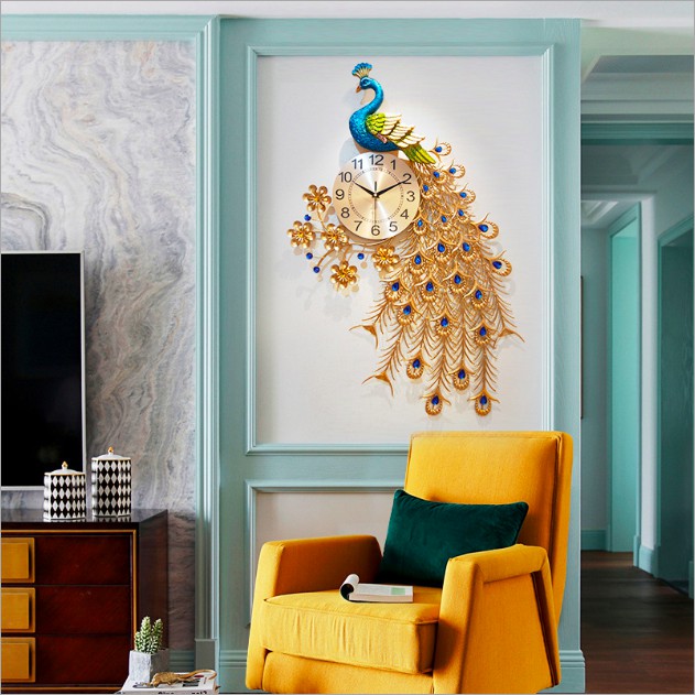 🕘 Đồng hồ trang trí treo tường thép sơn tĩnh điện chim công vàng rủ đuôi KD688 không đơn giản chỉ để xem giờ
