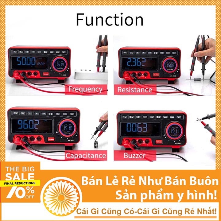 - Chức năng chính: Đo điện áp và dòng điện xoay chiều và DC , điện dung, diode, kiểm tra liên tục liên tục, tần số, đồng hồ báo thức, cho Bluetooth, v.v ...